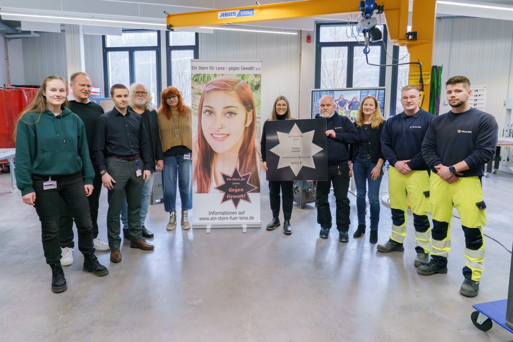 Mit großem Engagement und viel Kreativität haben die Auszubildenden in Esslingen der Netze BW handgefertigte Weihnachtssterne und Feuerkörbe versteigert. Das Ergebnis kann sich sehen lassen: Insgesamt kamen 3.642 € für unseren Verein „Ein Stern für Lena – gegen Gewalt! e. V.“ zusammen. Gemeinsam mit Jörg Reichert, Geschäftsführer der Netze BW, den Azubis und den Ausbildern wurde uns der symbolische Spendenscheck in Form eines Sterns am 03.02.2026 im Ausbildungszentrum in Esslingen übergeben. Wir bedanken uns ganz herzlich für diese Aktion und den großen Spendenbetrag.
